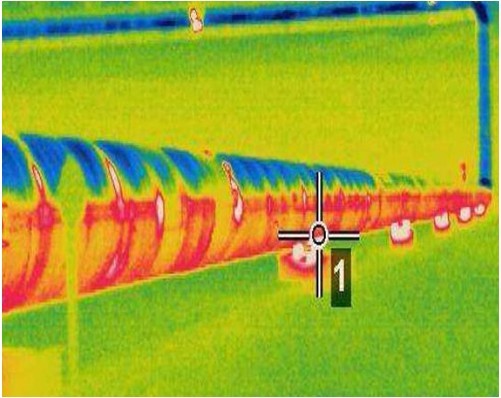 The lower photo in Figure 2 is the actual pipe section. The upper photo is a Thermal-Gram of that pipe, the white color in the lower area of thermal-gram in Figure 2 is the hottest area and the yellow and orange areas represent cooler sections of the outer jacketing (moving upward). The white color along the bottom of the pipe is associated with hot water and steam laying in the bottom of the jacketing and eventually collected sufficient volume to come into contact with the bottom area of the hot pipe (gravity has allowed the water and condensate to collect in the bottom of the insulation system). Higher on the exterior jacket, the temperatures decrease because the insulation is drier and becomes more effective.